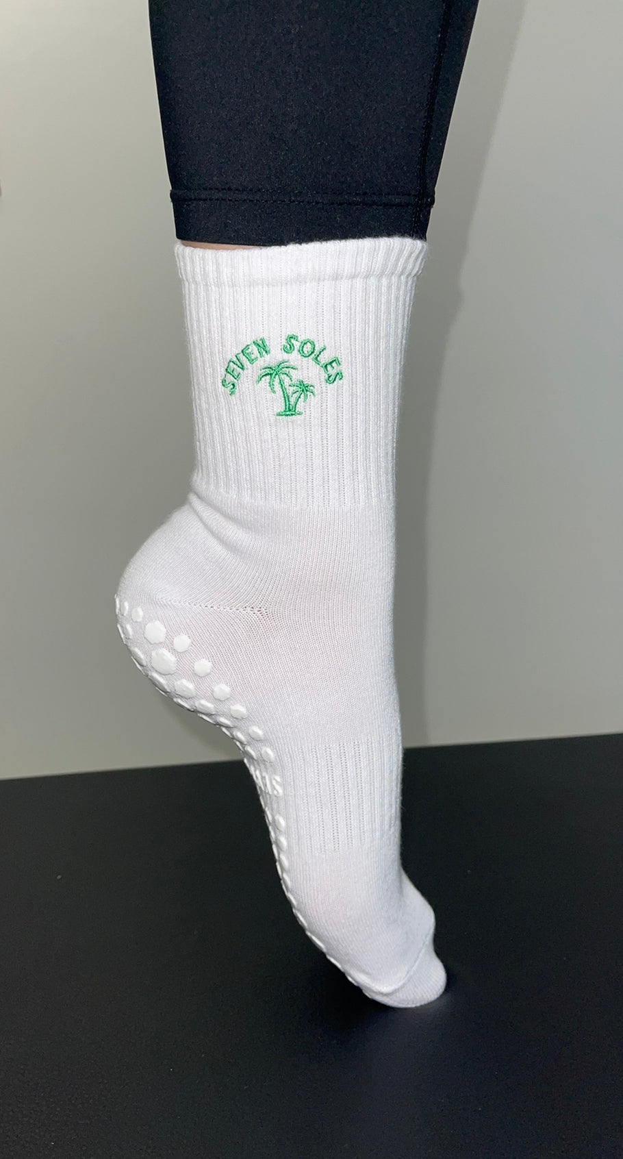 Green Palm Tree Grip Socks in fresh white. These socks are high quality, with a grip that will never slip. 🌴